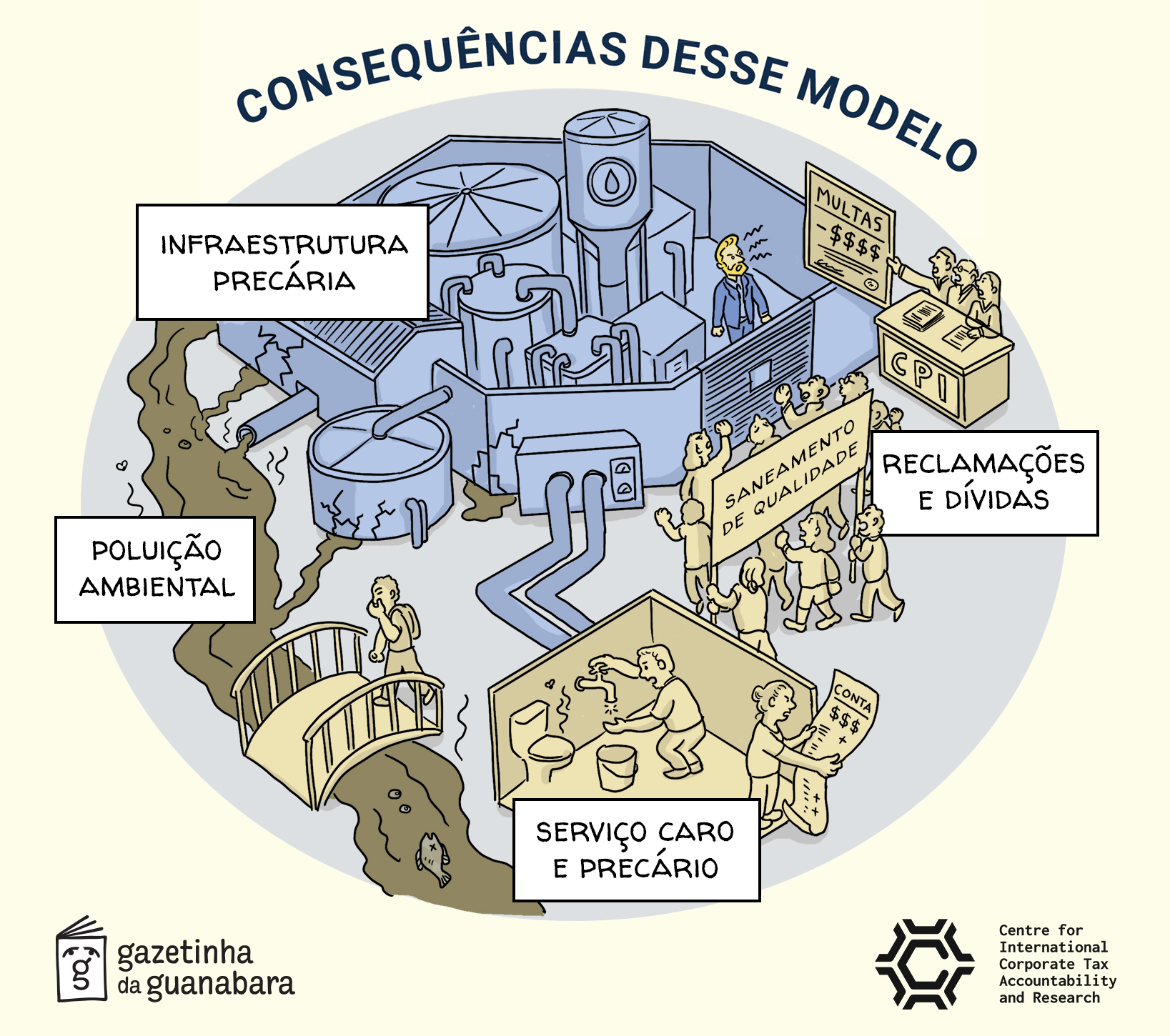 Lançado na sede do Sindicato dos Trabalhadores em Água, Esgoto e Meio Ambiente no Estado da Bahia (SINDAE-BA), esse folheto cumpre o papel de divulgação de um estudo do Centro para a Responsabilização e Pesquisa Tributária Internacional das Empresas (CICTAR) com o sindicato, que conta também com o apoio da Internacional de Serviços Públicos (ISP), Confederação Nacional dos Urbanitários (CNU) e do Observatório dos Direitos à Água e ao Saneamento (ONDAS).