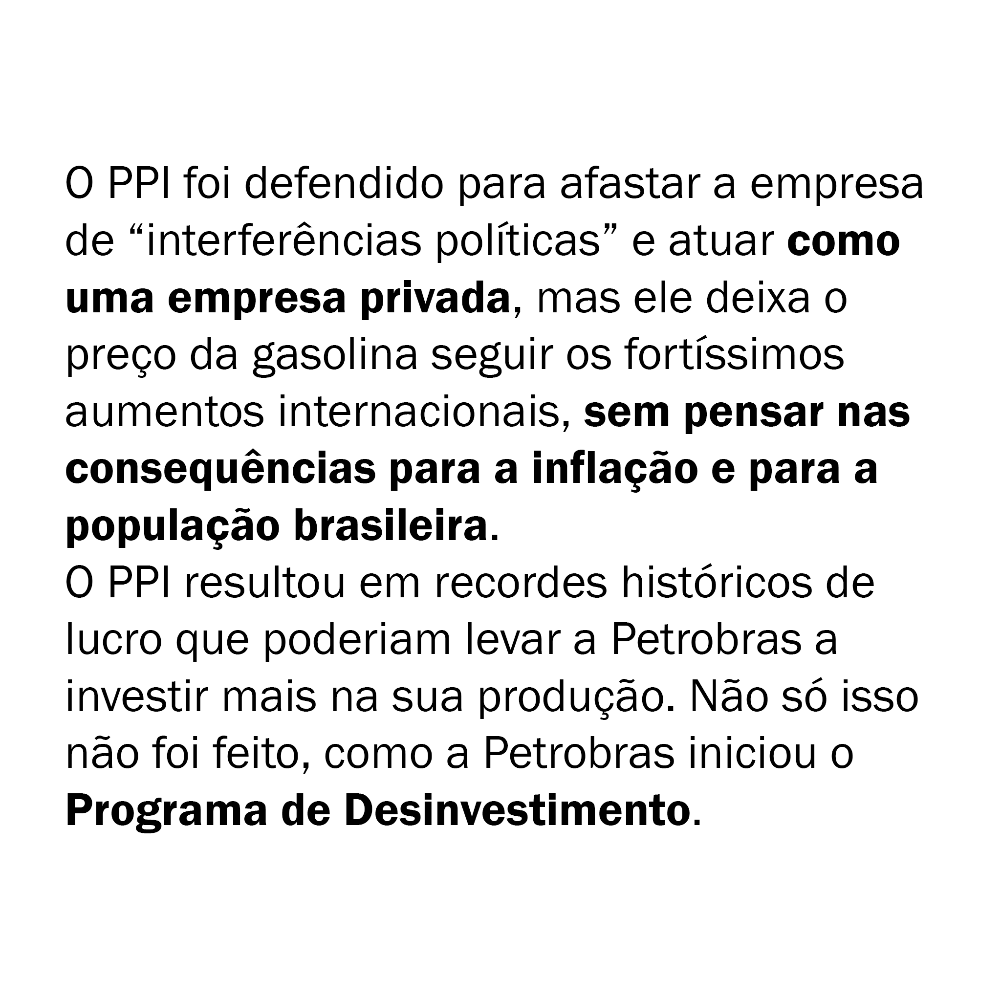 O PPI foi defendido para afastar a empresa de “interferências políticas” e atuar como uma empresa privada, mas ele deixa o preço da gasolina seguir os fortíssimos aumentos internacionais, sem pensar nas consequências para a inflação e para a população brasileira.