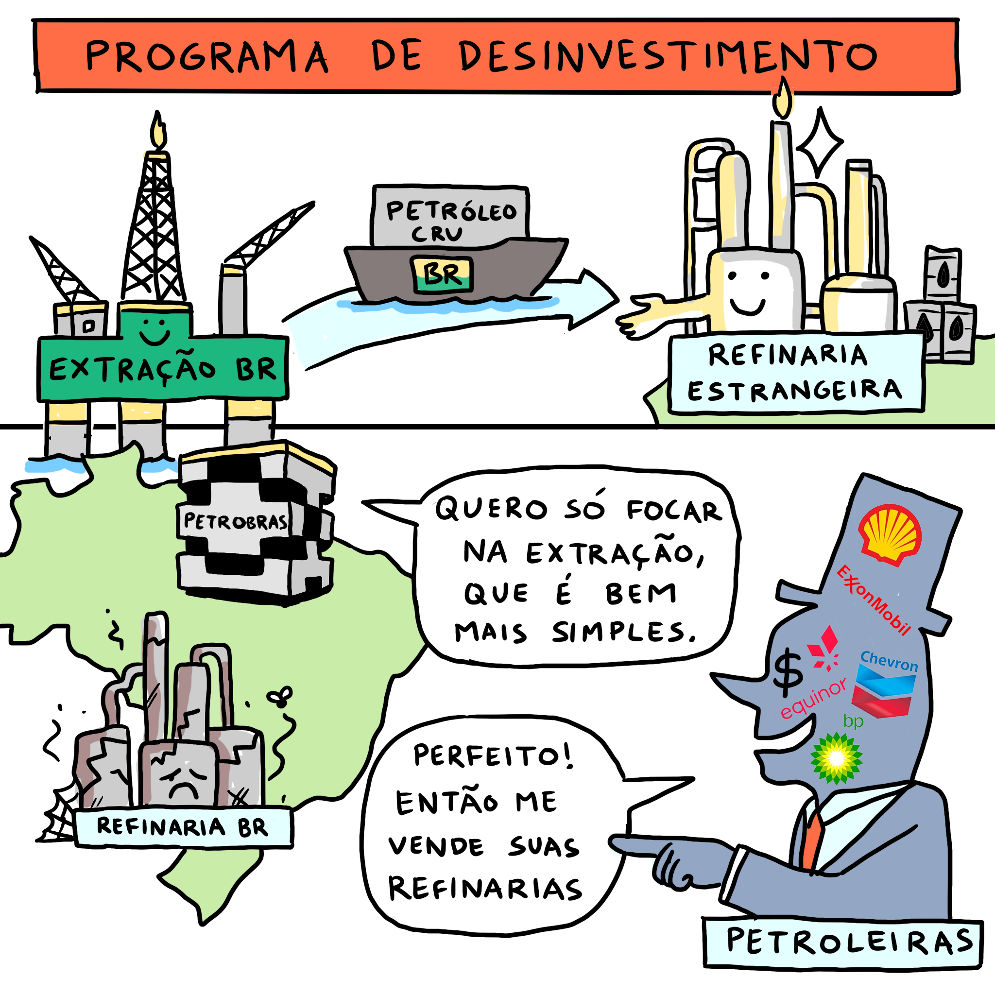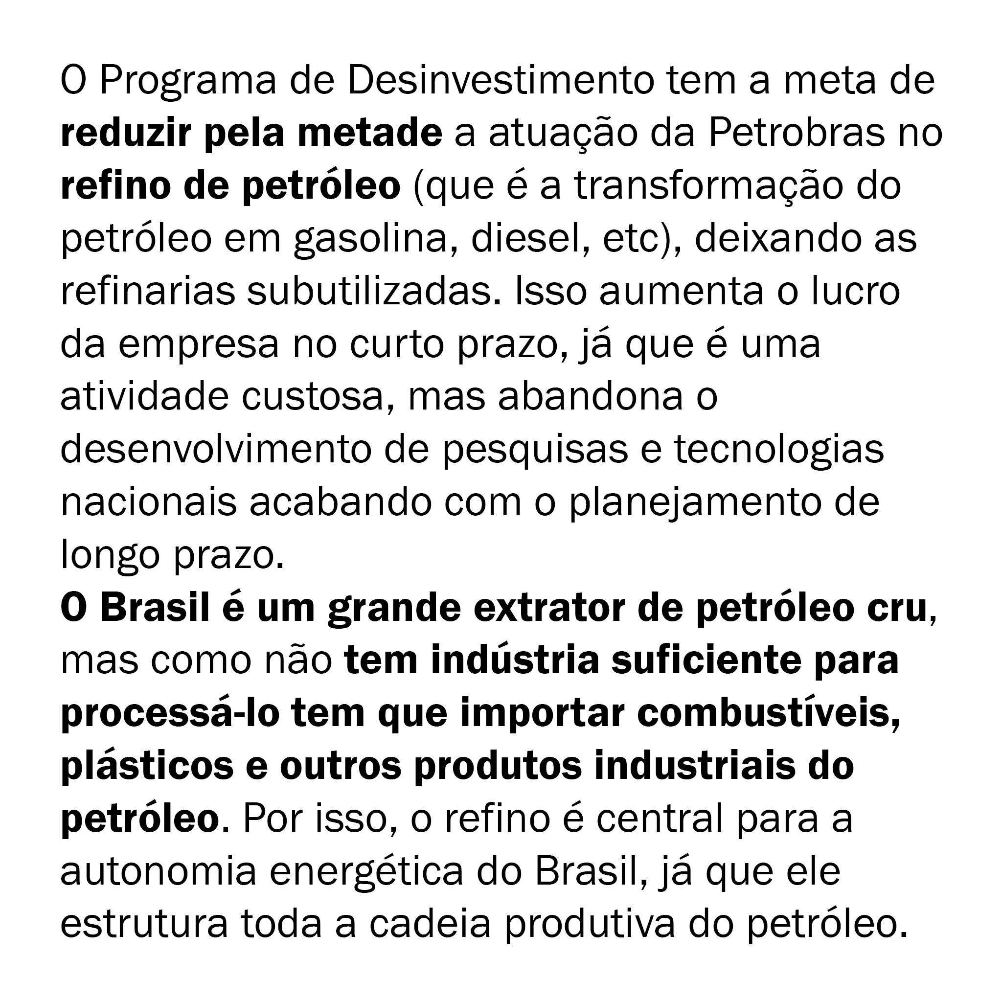 Esse Programa de Desinvestimento tem a meta de reduzir pela metade a atuação da Petrobras no refino de petróleo (que é a transformação do petróleo em gasolina, diesel, etc), deixando as refinarias subutilizadas. Isso aumenta o lucro da empresa no curto prazo, já que é uma atividade custosa, mas abandona o desenvolvimento de pesquisas e tecnologias nacionais acabando com o planejamento de longo prazo.