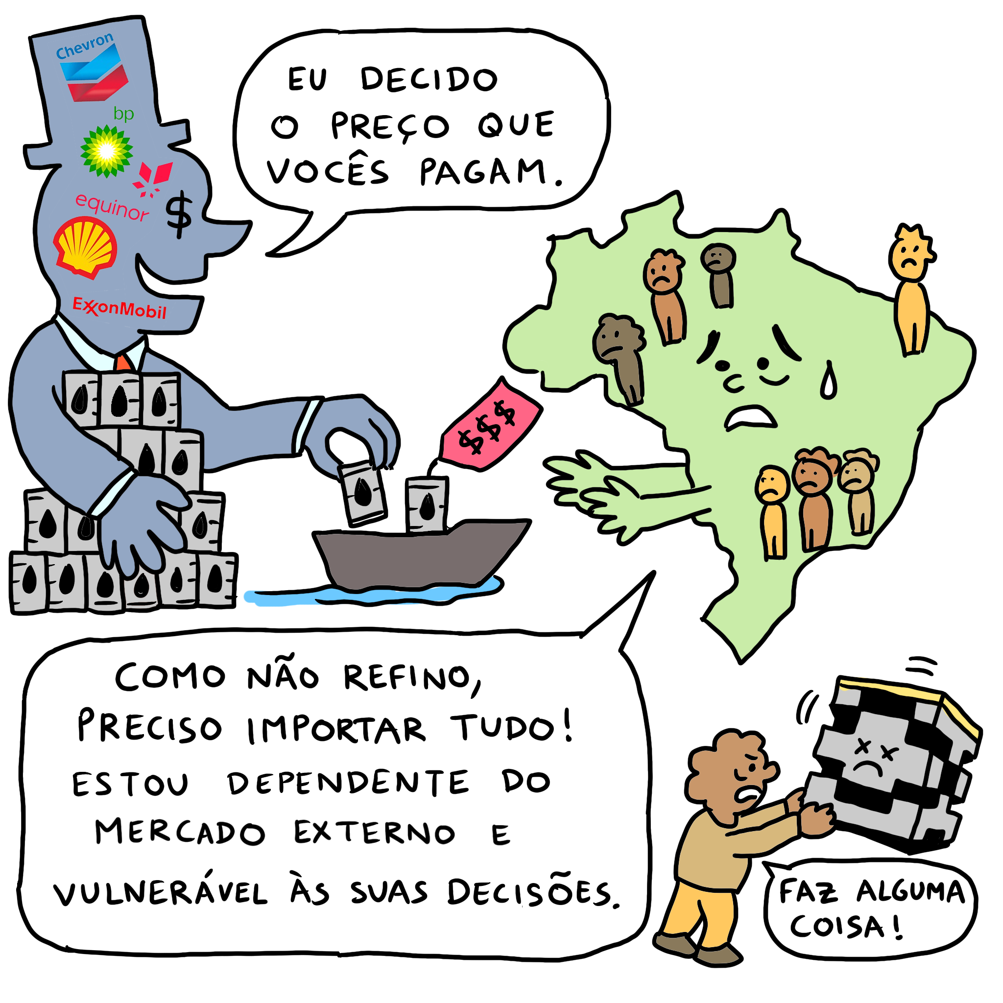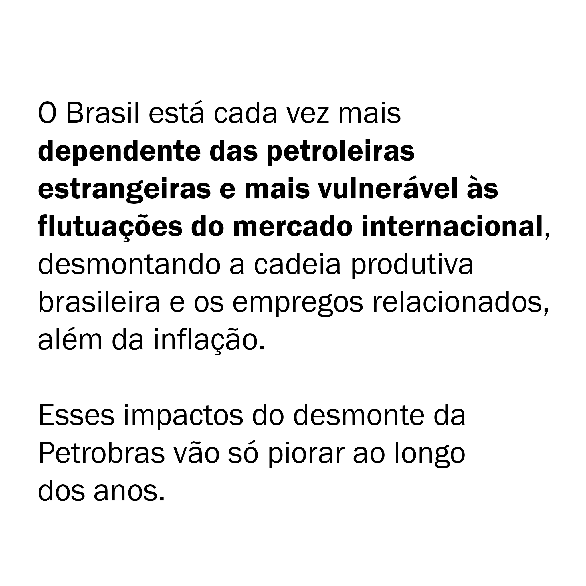 Com isso, o Brasil fica cada vez mais dependente das petroleiras estrangeiras e mais vulnerável às flutuações do mercado internacional, desmontando a cadeia produtiva brasileira e os empregos relacionados, além da inflação.