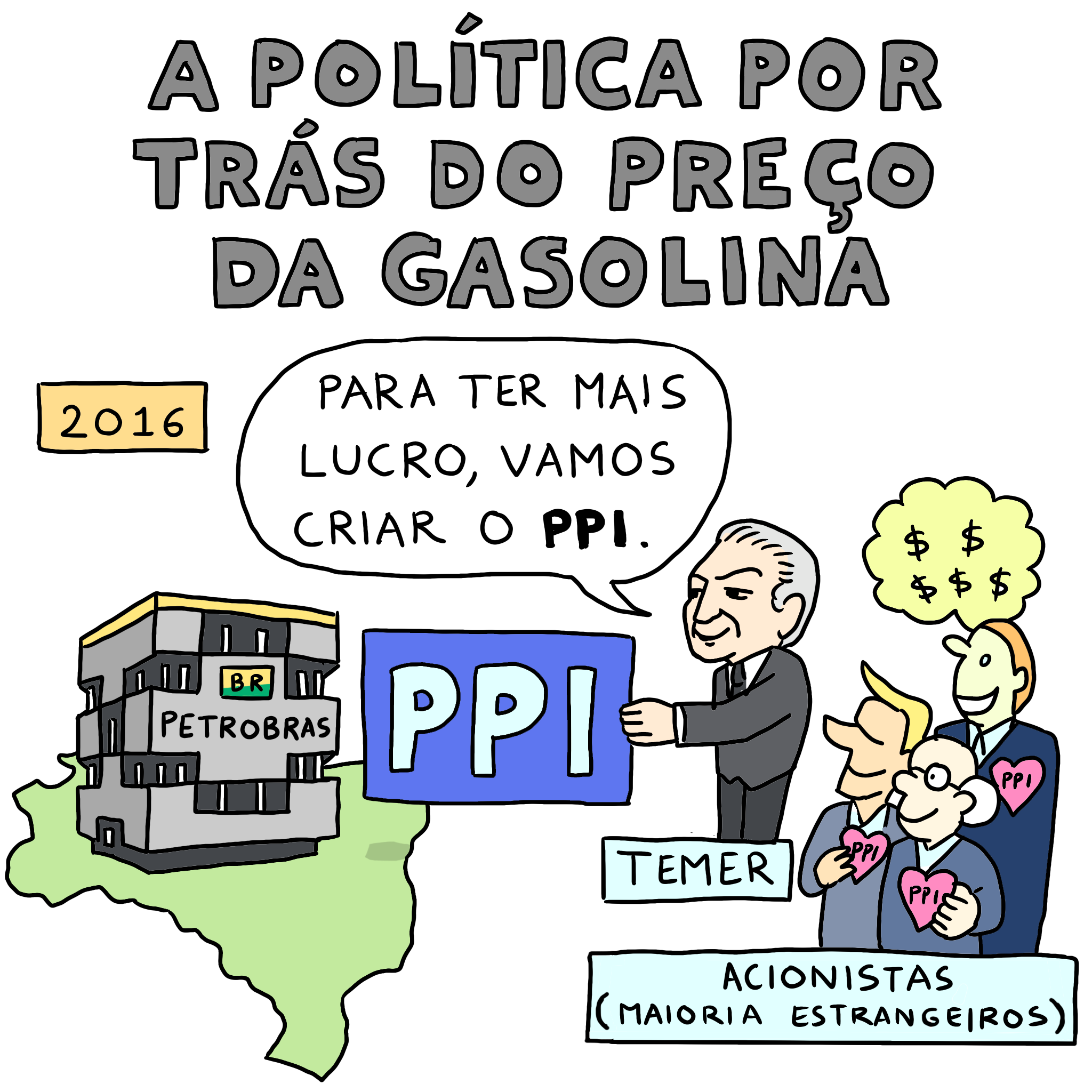 Em 2016, durante o governo de Temer, foi criada uma nova regra para a Petrobras definir o preço dos combustíveis no país. Por essa regra, as condições internas são ignoradas e se passa a definir o preço nacional com base nos preços no mercado internacional de combustíveis – é o chamado PPI (Preços de Paridade de Importação). Com isso, em 2021, a alta internacional do petróleo permitiu à Petrobras realizar lucros enormes, acompanhando um aumento de preços da gasolina em quase 50% !