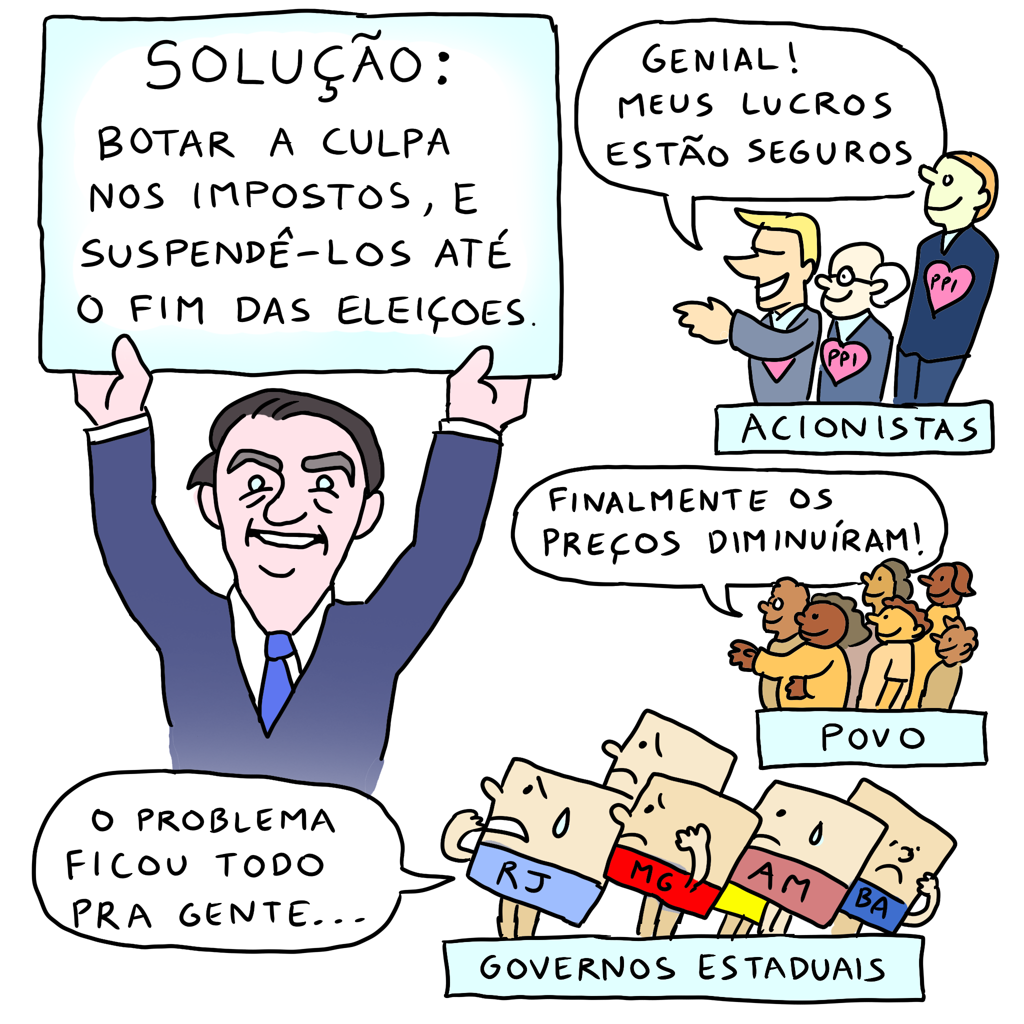 Bolsonaro optou por uma saída que não se chocasse com os interesses dos acionistas, mas que ao mesmo tempo fosse capaz, ao menos provisoriamente, de solucionar o problema dos preços dos combustíveis. Isso porque, além dos lucros da Petrobras, outra parte do preço da gasolina é composta por impostos para o governo federal e os governos estaduais. Ele criou então uma redução temporária dos impostos, em meio a um discurso de que seriam os impostos os maiores vilões e responsáveis pelo encarecimento dos produtos (e não o PPI e seus lucros recordes).